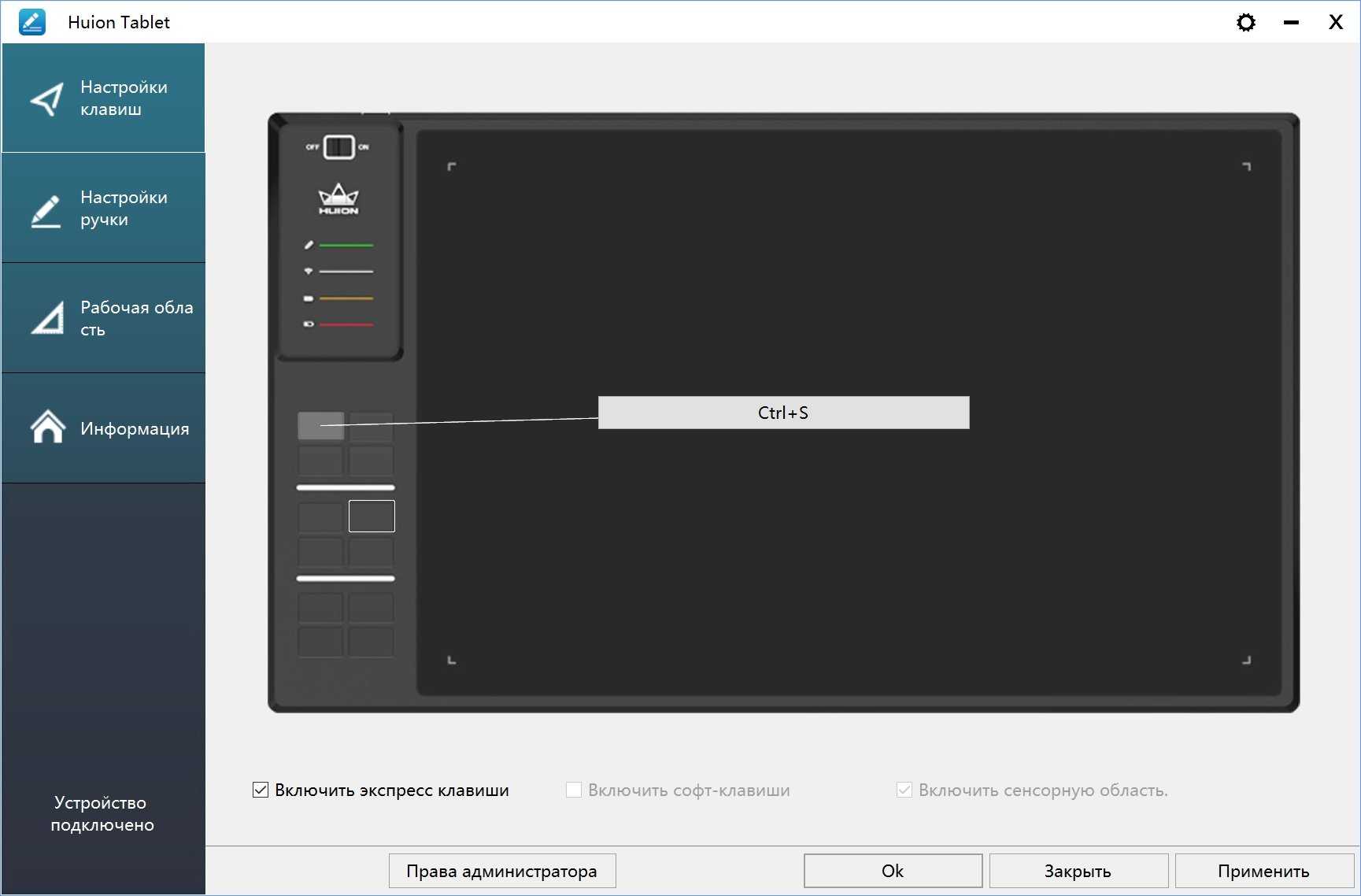 Утилита сама «определяет» модель планшета и предоставляет стандартный набор параметров для настройки: настройка клавиш, пера, рабочей области, сохранение/загрузку профилей.