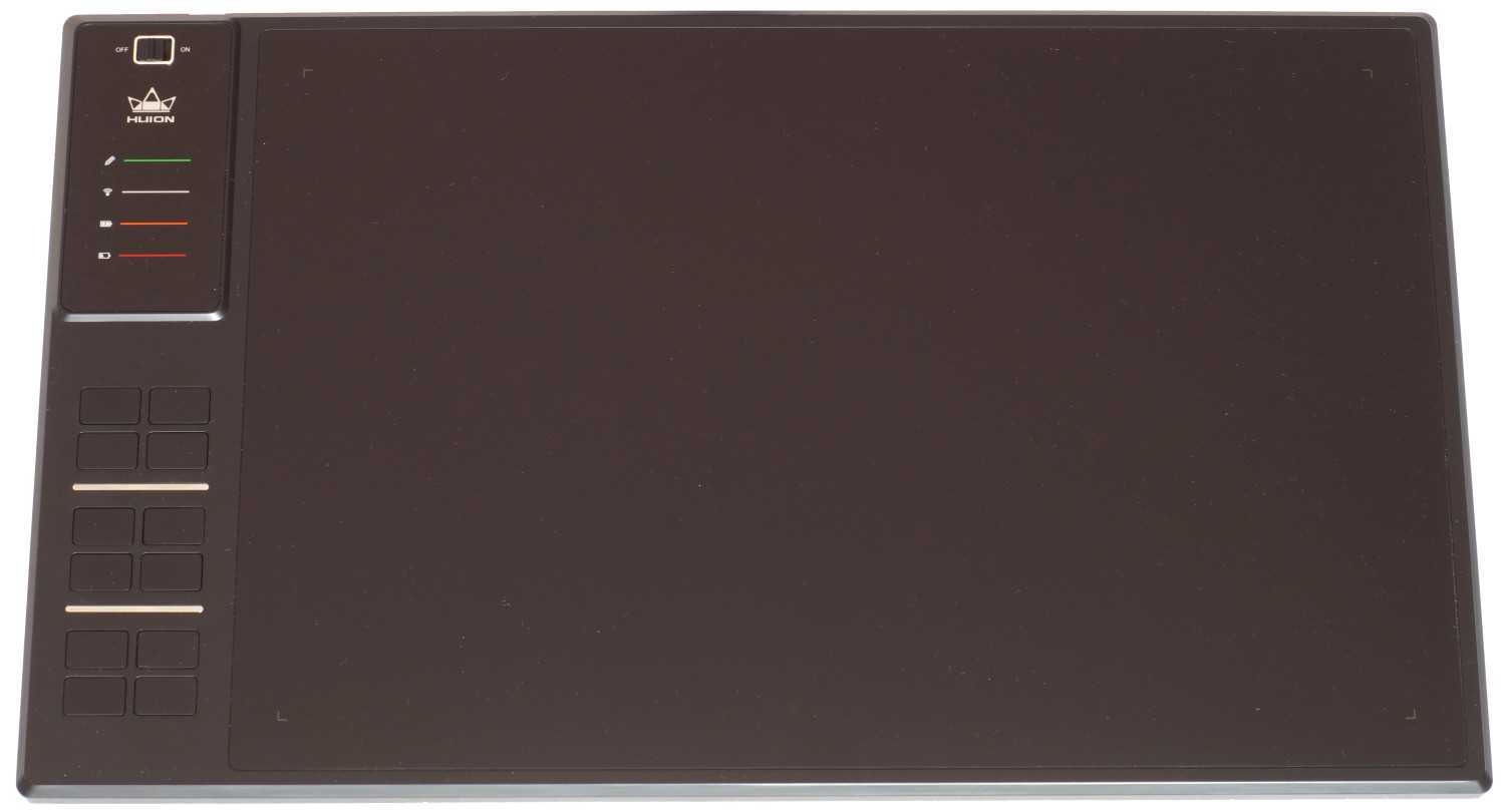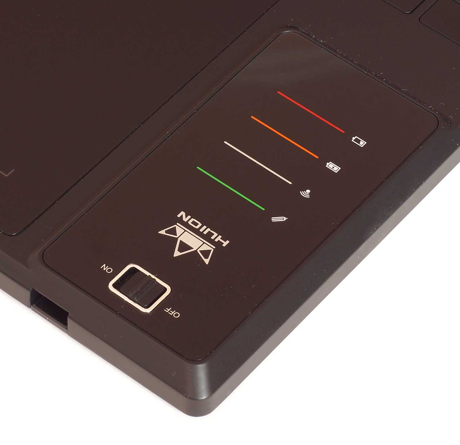 Так как планшет Huion WH1409 V2 поддерживает режим беспроводной работы, то чуть выше разместился переключатель включения/выключения и индикаторы работы пера, активности беспроводного режима, а также оставшегося заряда встроенного аккумулятора (его емкость составляет 2000 мАч), которого должно хватить на 40 часов работы.