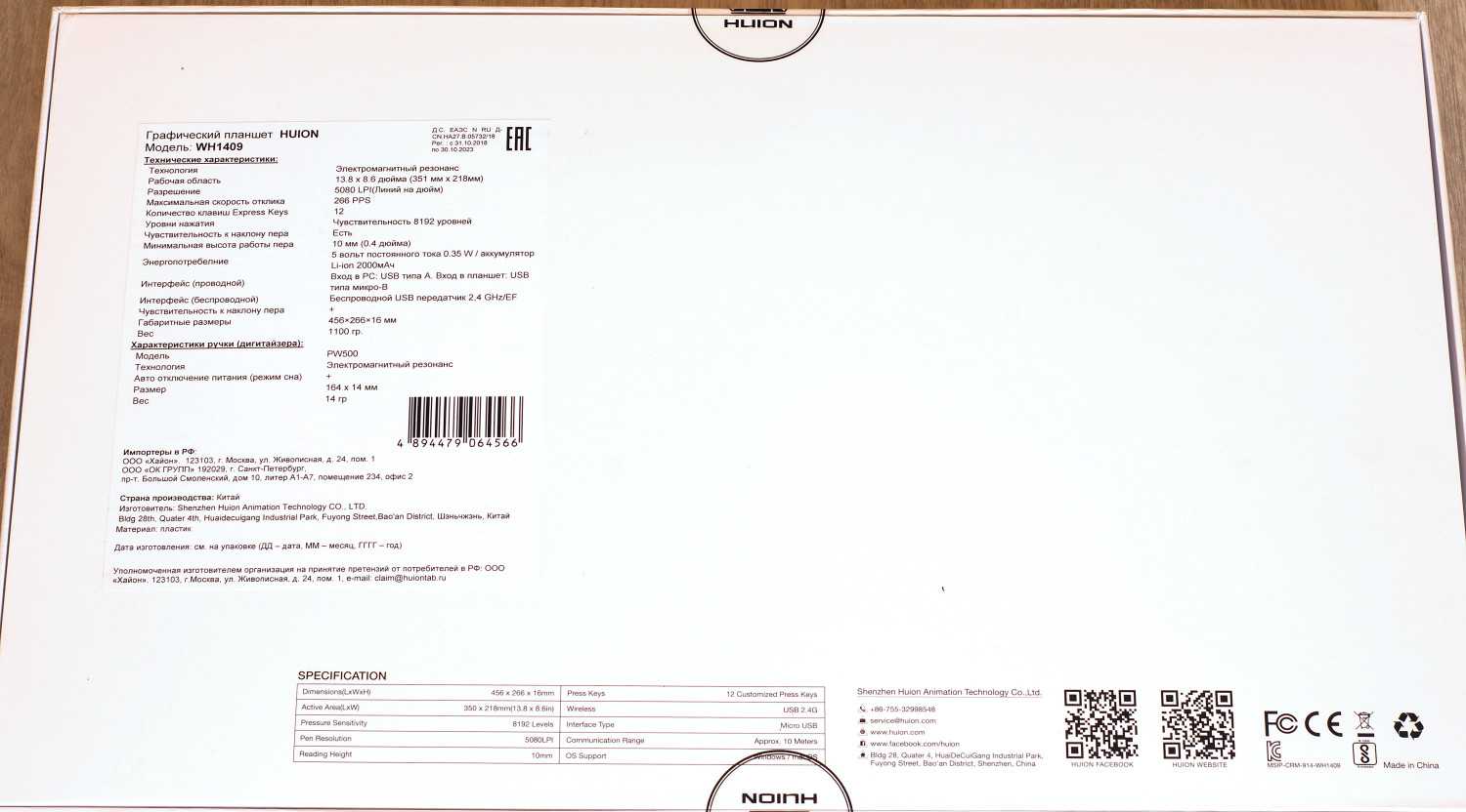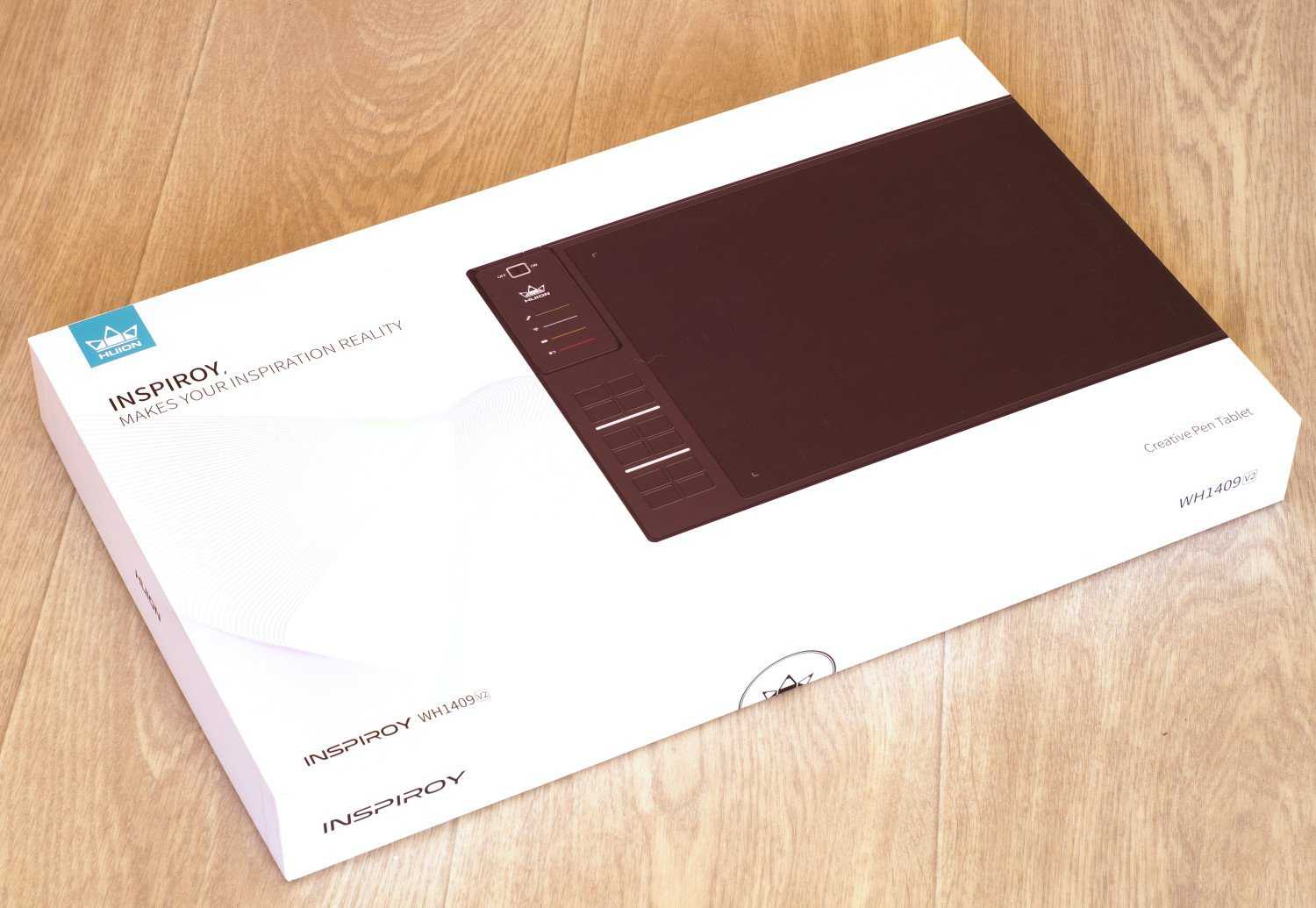 Дизайн упаковок для серии Inspiroy графических планшетов Huion неизменный, ив случае с планшетом Huion WH1409 V2на лицевой стороне можно обнаружить только изображение самого планшета с названием модели. Зато стоит отметить достаточно крупные размеры самой коробки и приличный вес – в защитной картонной коробке он составляет 2200 грамм.