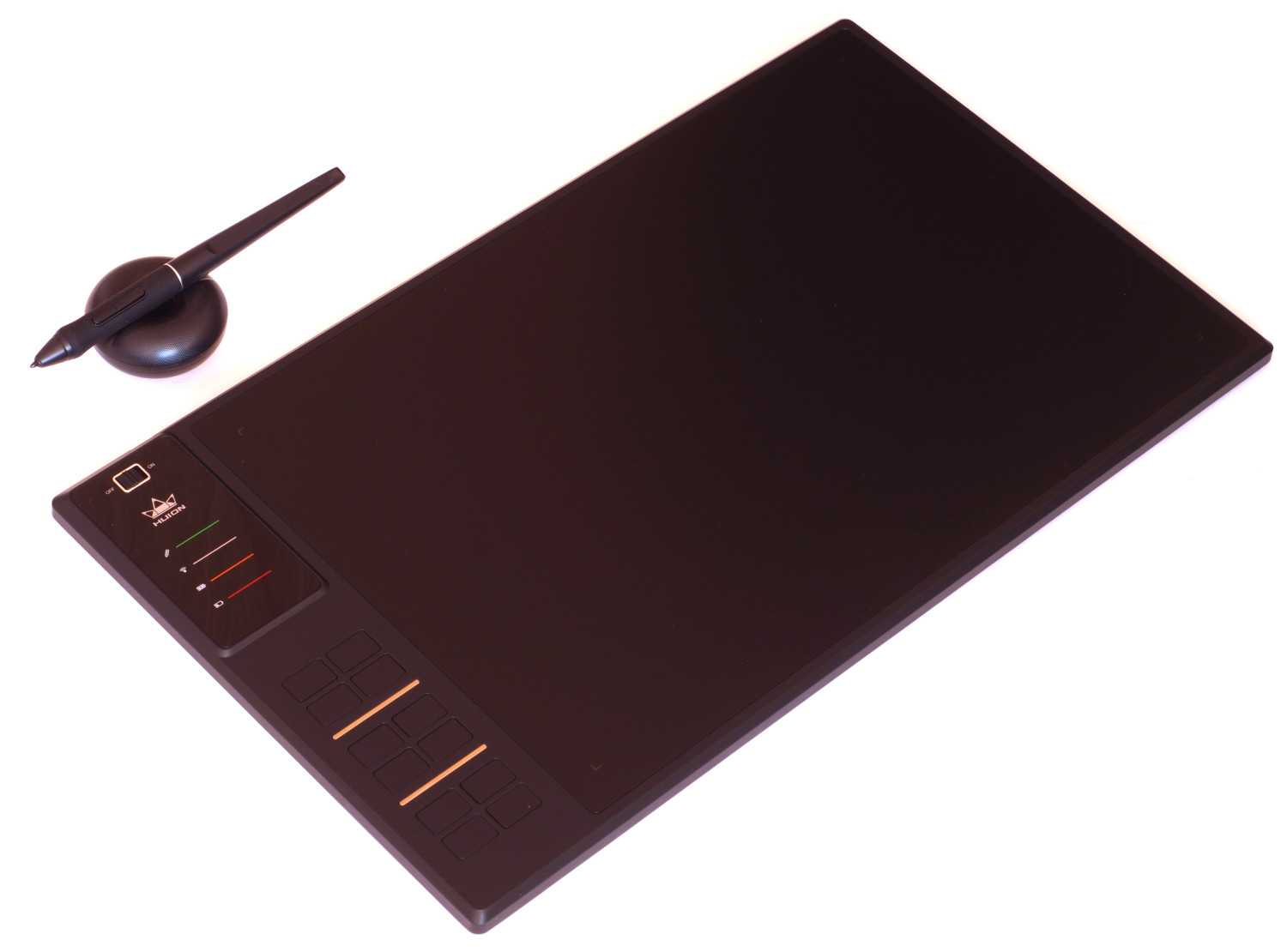 Оборудование средних размеров с набором из восьми горячих клавиш. Между кнопками находится световой индикатор, который реагирует на силу нажатия стилуса. По дизайну – это двойник XP-pen Star 03 v2. По функционалу планшет ближе к Wacom Intous PRO M, ценник у которого повыше. Две горячие клавиши присутствуют на самом пере. Пользоваться удобно, подключение простое – драйвера есть на сайте производителя. Интерфейс подключения – USB, так что танцы с бубном отменяются. Можно настроить планшет и стилус под себя. Минусом являются наконечники, которые быстро стираются, и в руках неопытных пользователей могут оставлять царапины на планшете. Нет поддержки мультитач, а перо не чувствительно к наклону.