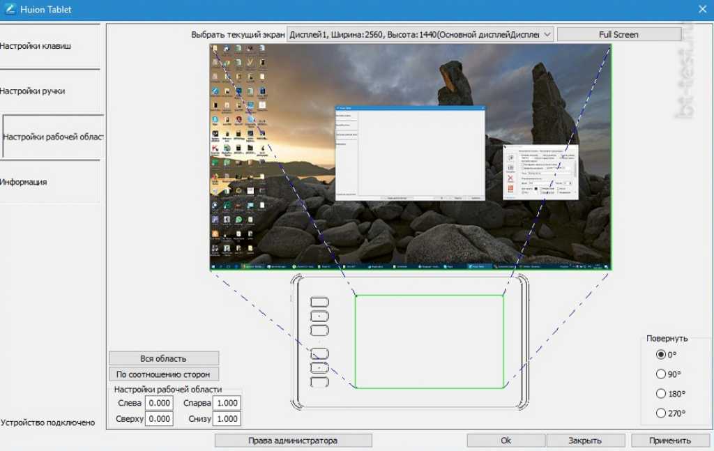 3. В разделе «Рабочая область» привязываем работу планшета к определенному монитору, задаем область и, если необходимо, поворачиваем ее на угол, кратный 90 градусам.