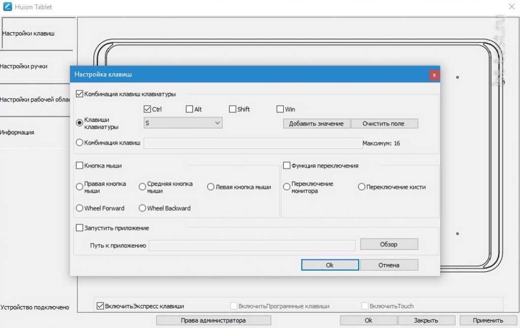 Перевод на русский выполнен профессионально. Никаких «загрузить водителя блокнота» (load driver for tablet) тут не обнаружите. На горячие кнопки можно настроить сочетания клавиш на клавиатуре, клавиши и колесико мышки, а также специфические переключатели, например, для мониторов или кистей. При желании можно превратить горячую клавишу в шорткат для приложения. Кастомизация клавиш на высоте.
