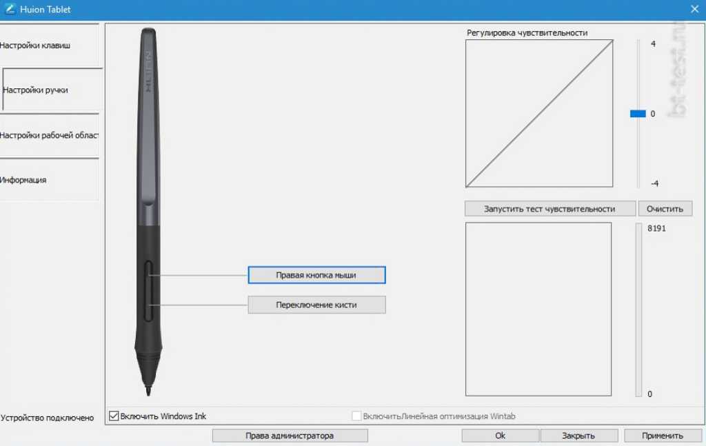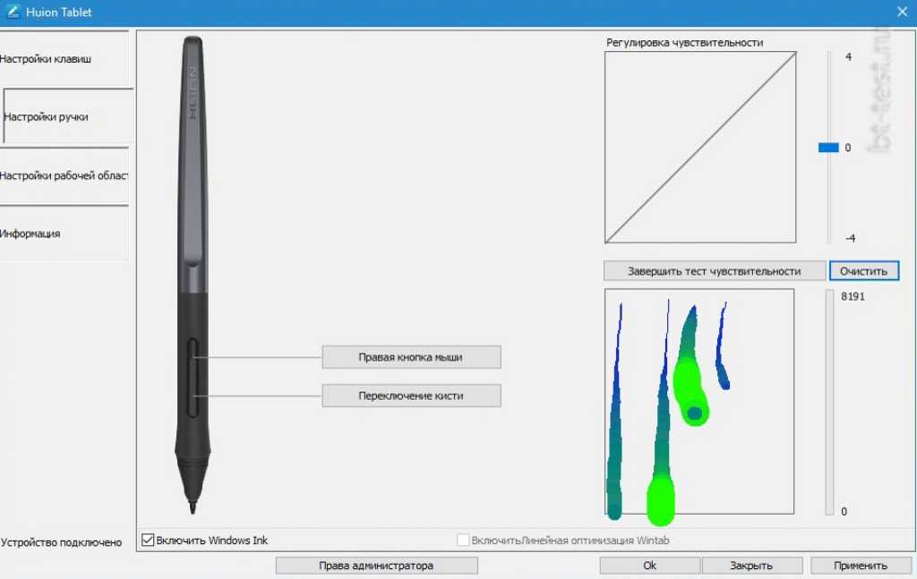 2. Также возможно «запрограммировать» действия на две кнопки пера. Это делается через раздел «Настройки ручки». Здесь же настраивается чувствительность и можно провести тест.