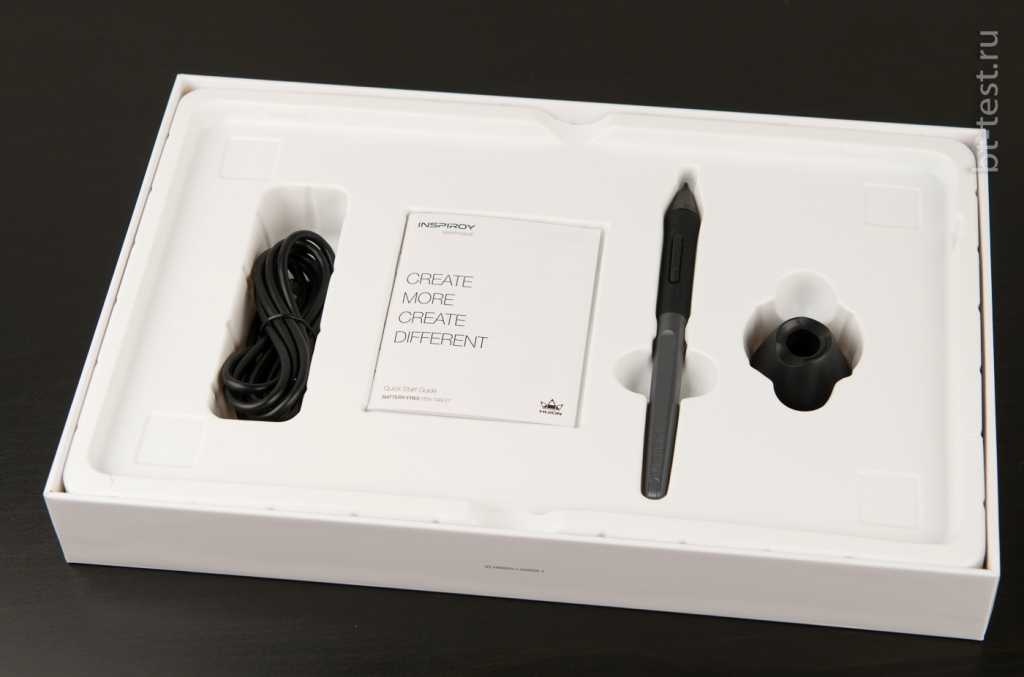 Планшеты упакованы в стильные белые коробки. Внутри находятся сам планшет, притопленный в мягкий пластик, а на дне упаковки обнаружились гарантийный талон, инструкция на русском, перо с подставкой и кабель. Диска с драйвером нет. По словам производителя, это сделано для того, чтобы пользователь всегда скачивал последнюю версию драйвера с сайта.