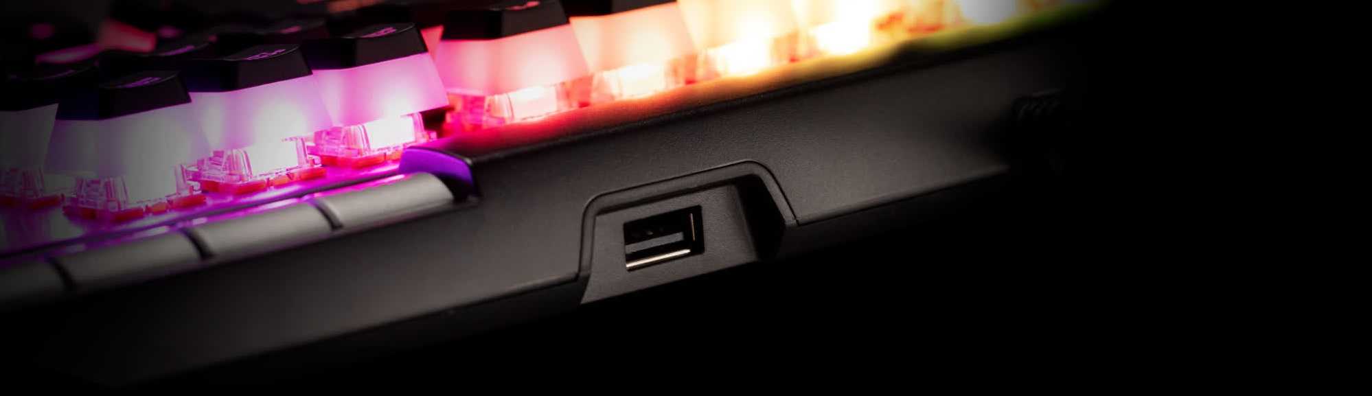Игровой режим с отключением вредных клавиш и сочетаний – гениальная вещь. Кнопка Win – это вечное проклятие всех геймеров. Роллер громкости также не будет лишним. За функциональный USB-порт, выведенный отдельным каналом, создателям Alloy Elite RGB всяческое уважение.