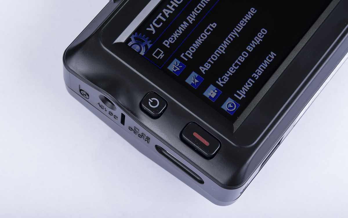 Слева от экрана – две клавиши. Верхняя – включение/выключение, нижняя – старт/остановка записи, защита текущего видеофайла от перезаписи. Кнопки крупные, ход четкий.