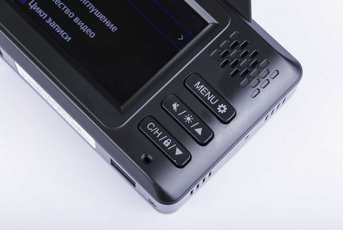 Справа – динамик и удлиненные управляющие клавиши, у каждой несколько функций в зависимости от «долгости» нажатия (в частности, вызов настроек, изменение режимов работы радар-детектора, включение/выключение микрофона, экрана, регулировка громкости и яркости). Похвальный подход – чаще производители обозначают в лучшем случае одну из нескольких функций.