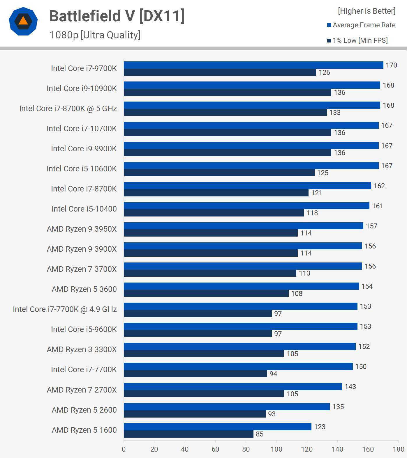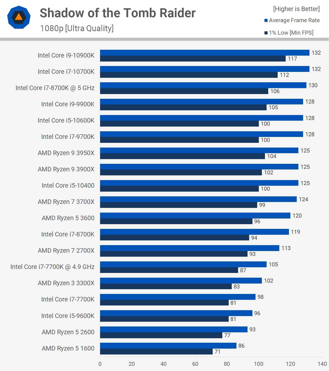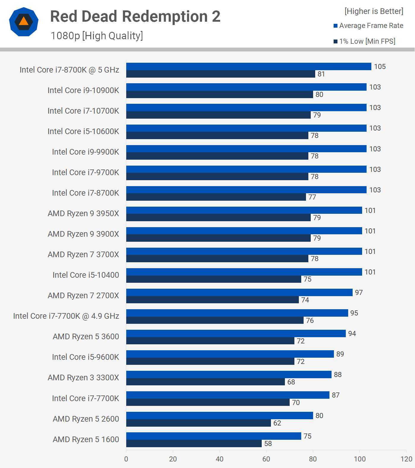 И наконец, у нас есть Red Dead Redemption 2, где мы видим преимущество в производительности до 18% в пользу 8700K по сравнению с 7700K при сравнении исходной производительности. 8700K также сопоставим в этом названии с более новыми и более дорогими процессорами Intel, такими как 10700K и 10900K.