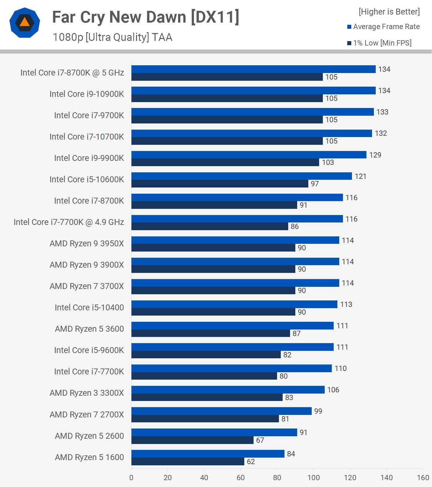 Даже в Far Cry New Dawn, который мы не воспринимаем как игру с тяжелым ядром, мы видим некоторые преимущества от 6-ядерного 8700K, а при разгоне обеих частей 8700K оказывается на 22% быстрее.