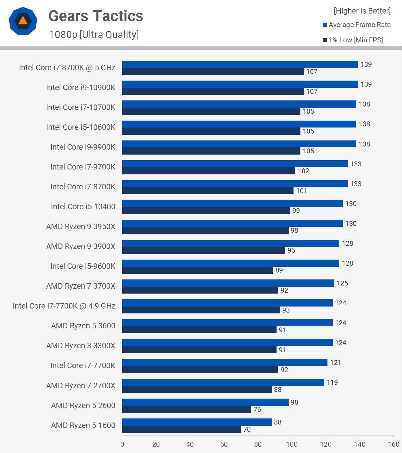 Мы видим небольшой прирост ~ 10% при сравнении процессоров Core i7 7-го и 8-го поколений в Gears Tactics. После разгона до 5 ГГц 8700K может сравниться с новым Core i9-10900K, что дает очень впечатляющий результат, что доказывает, почему он по-прежнему остается одним из лучших игровых процессоров.