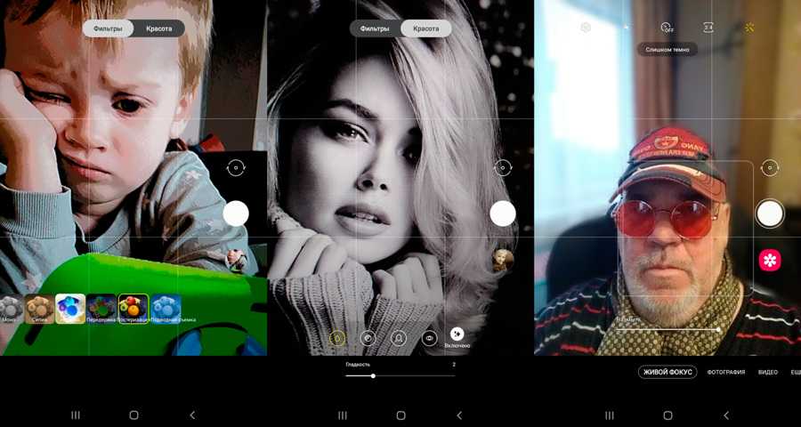 При съемке чужих и своих портретов, помимо активации одного из фильтров, предлагается воспользоваться «бьютификаторами» (гладкость и тон кожи, линия подбородка, глаза). В режиме «Живой фокус» легко отрегулировать степень размытия заднего плана.