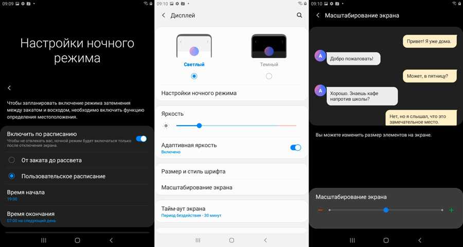 В разделе «Дисплей» ночной режим можно включить немедленно, либо предусмотреть в настройках его действие от заката до рассвета, либо по расписанию пользователя. Уровень подсветки регулируется вручную или автоматически (опция «Адаптивная яркость»). В домашних условиях запаса яркости, как правило, вполне достаточно. На соответствующих вкладках настроек предлагается определиться с размером и стилем шрифта, а также масштабом изображения на экране.